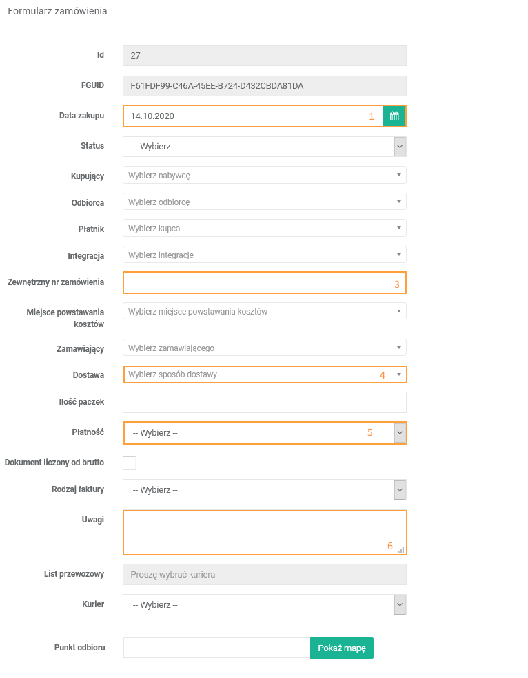 | Edycja zamówienia > Formularz zamówienia | Data zakupu | 1 | Sales -> Orders -> View-> Order& Account Information | Order Date | 2 | |