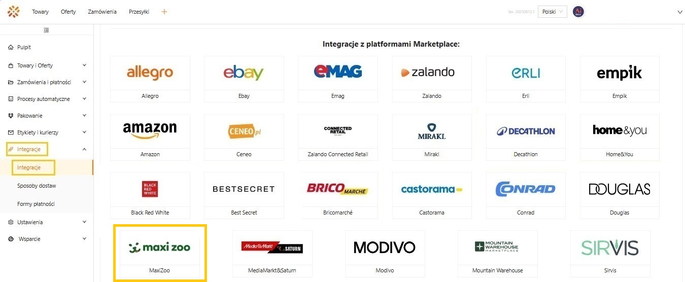 - W sekcji Integracje z platformami Marketplace należy wyszukać tej z logo i nazwą Maxi Zoo