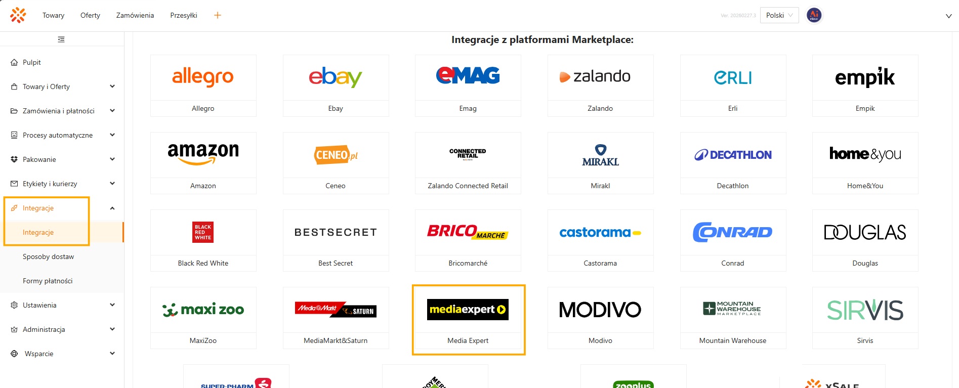 - W sekcji Integracje z platformami Marketplace należy wyszukać tej z logo i nazwą Media Expert
