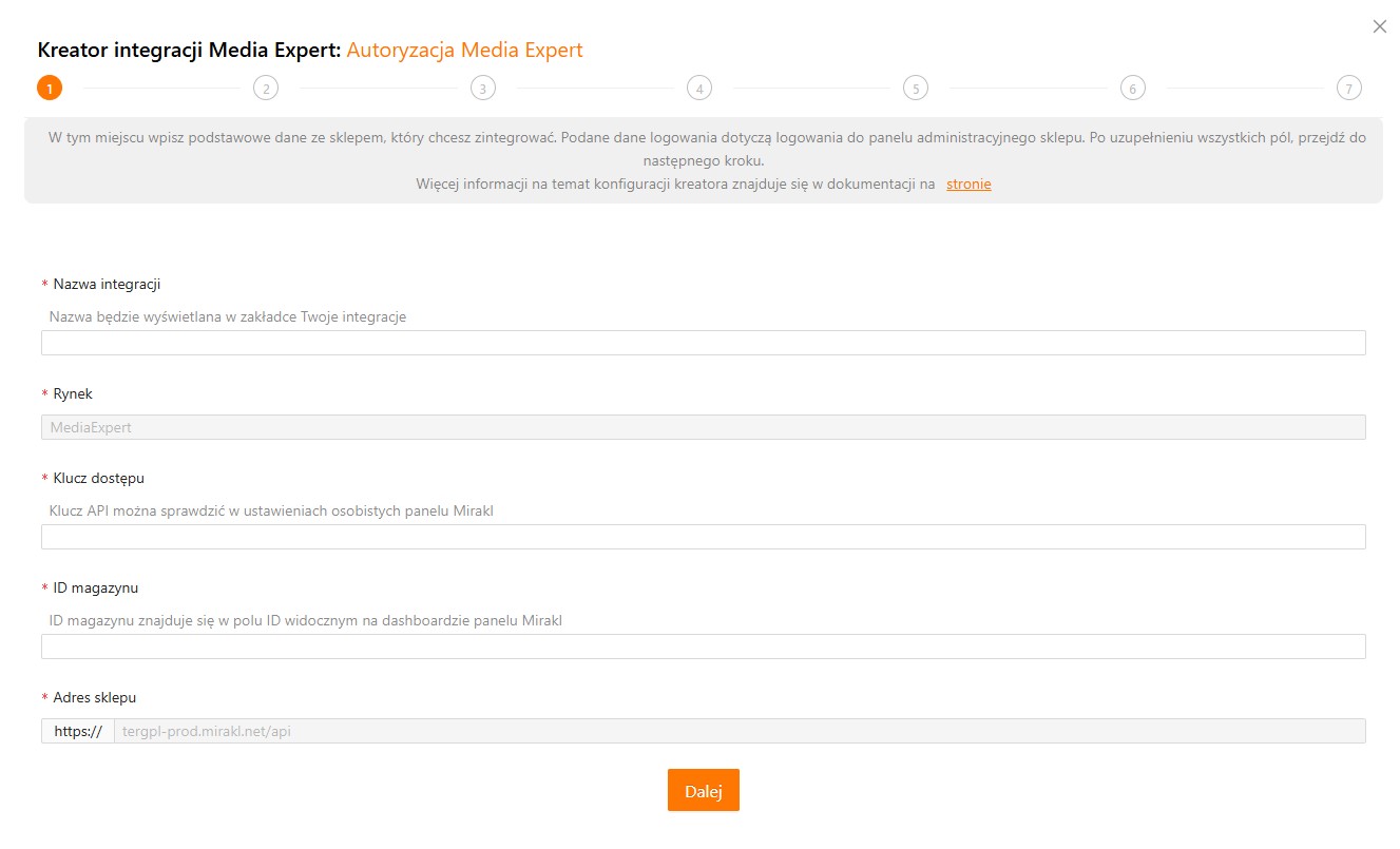 Dodanie integracji z Media Expert jest możliwe za pośrednictwem kreatora integracji Mirakl, w przygotowanej wersji dla marketplace Media Expert.