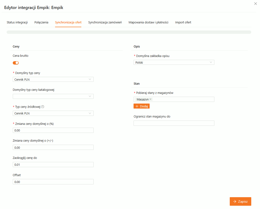 Przy synchronizacji ofert istnieje możliwość ustawienia parametrów, które dotyczą cen, opisu i stanów: