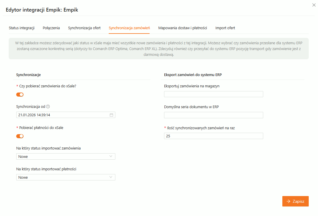 Ustawienia w tej zakładce dotyczą nowych zamówień (czy należy je pobierać i od kiedy) oraz płatności związanych z tą integracją (czy pobierać, z jakim statusem).