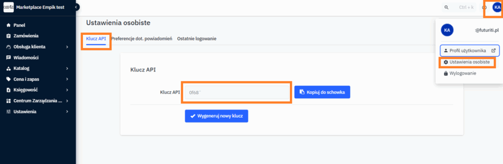 W prawym górnym rogu znajduje się logo użytkownika, należy je kliknąć i przejść w Ustawienia osobiste. Następnie wybrać zakładkę Klucz API. Wyświetli się pole z właściwym kluczem API, który należy skopiować i wkleić do pola w kreatorze.