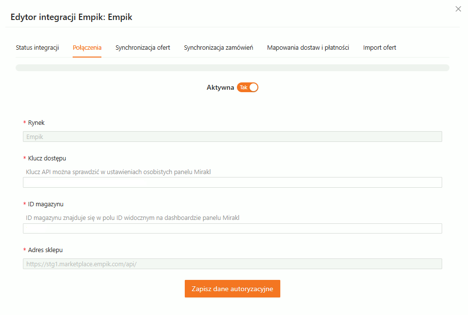 Po prawidłowej integracji, istnieje możliwość wejścia w tryb „Edytuj” na integracji z Mirakl, gdzie można sprawdzić i ustawić następujące parametry: