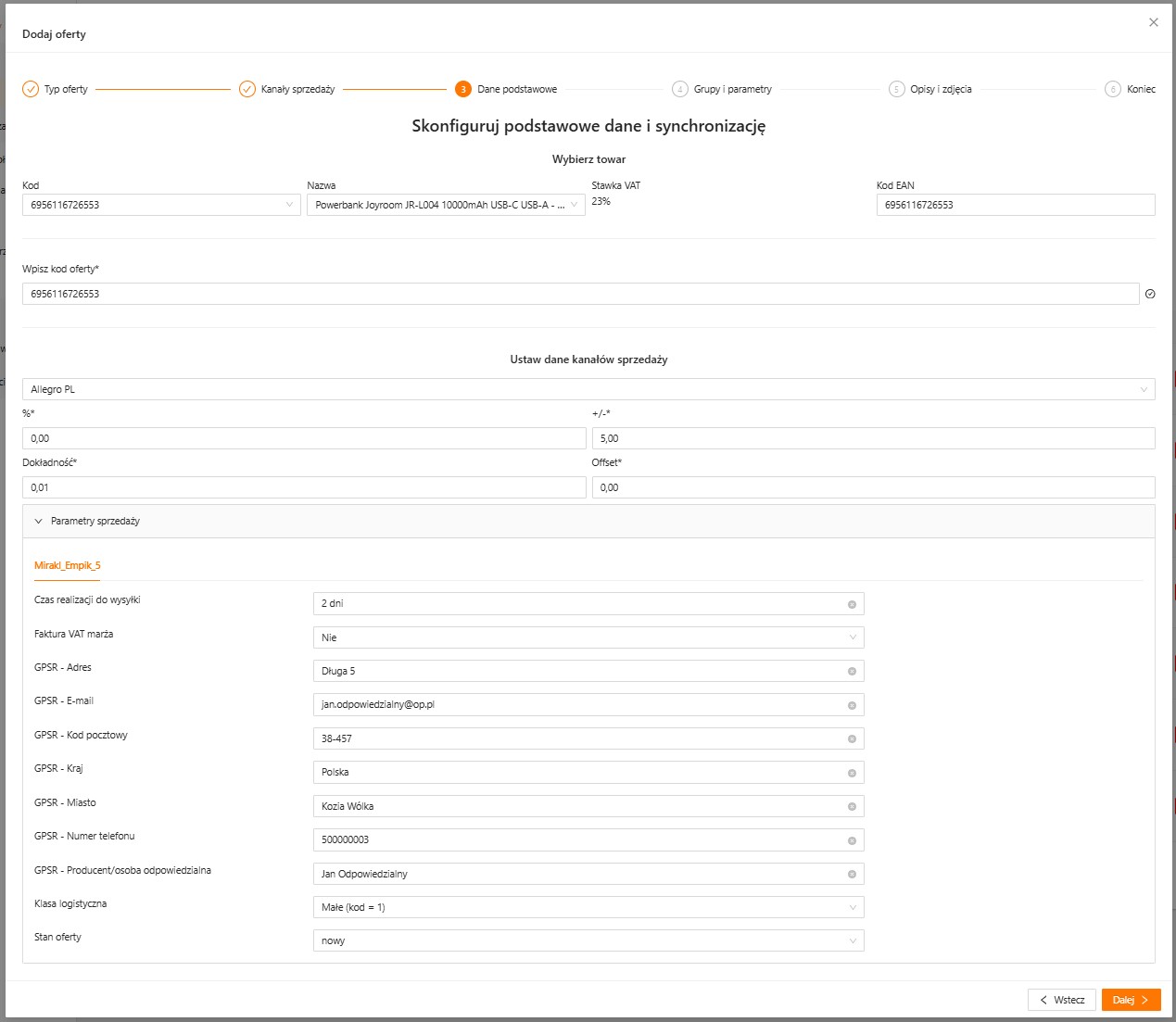 Przy dodawaniu oferty istnieje możliwość uzupełnienia dedykowanych dla Mirakl parametrów sprzedaży: Czas realizacji do wysyłki, Faktura VAT marża, Klasa logistyczna, Stan oferty, kwestie związane z GPSR.