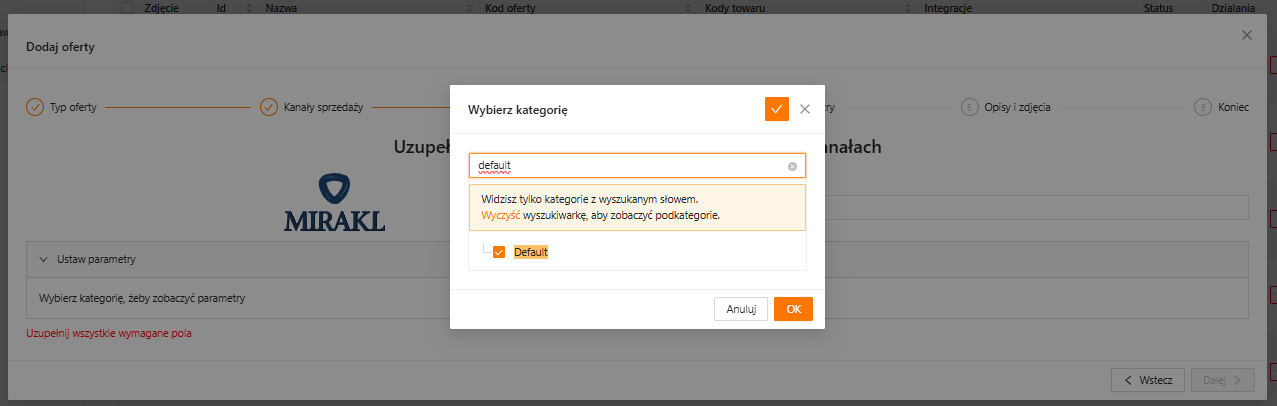W kolejnym kroku, przy wyborze Kategorii, należy wskazać kategorie ogólną/domyślną, wpisując „Default” – z uwagi, że nie pobieramy kategorii tematycznych z Mirakl.