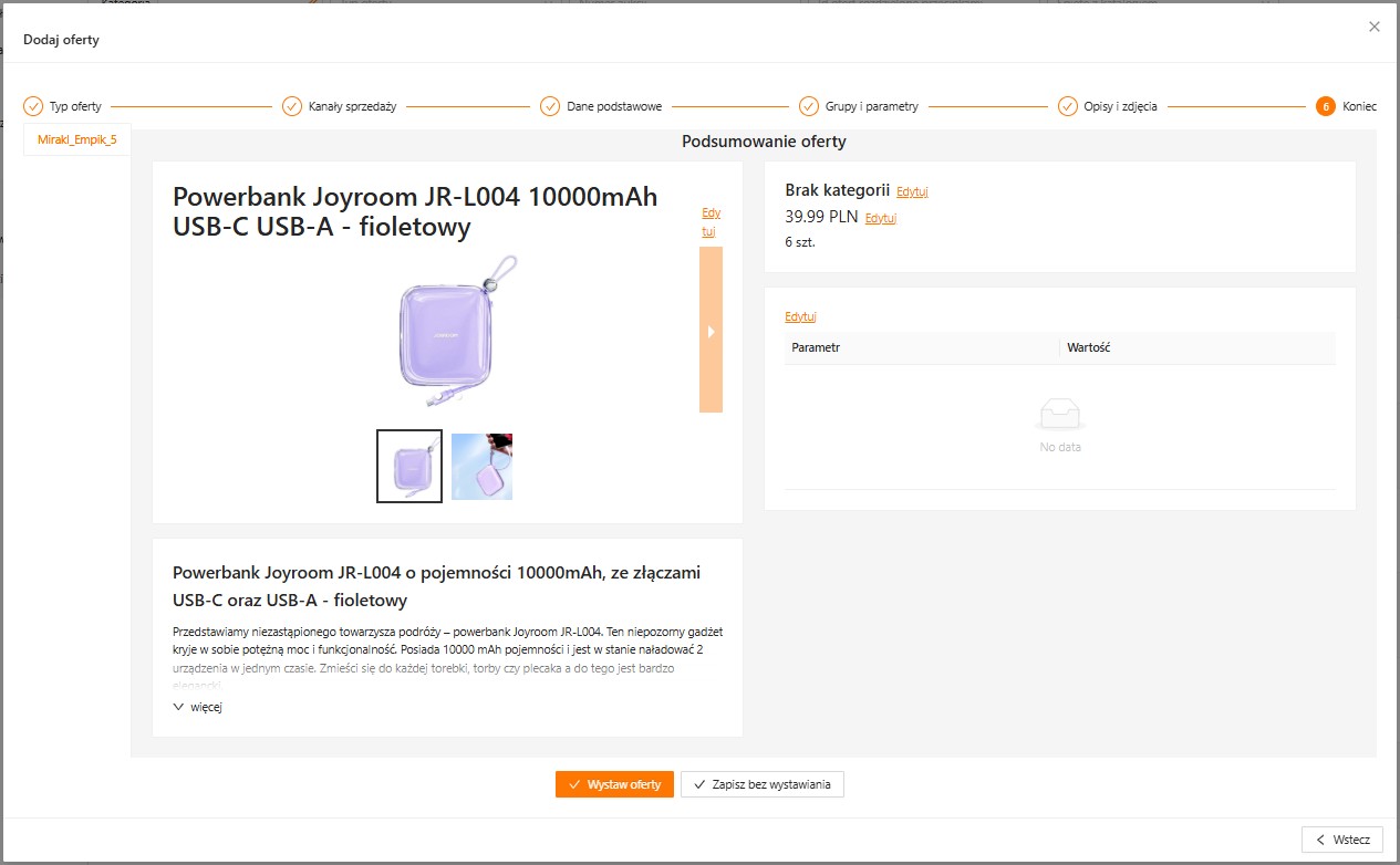 Aktualnie istnieje możliwość stworzenia wyłącznie oferty pojedynczej do Mirakl. Zestawy i oferty wielowariantowe nie są obecnie obsługiwane w integracji z Mirakl.