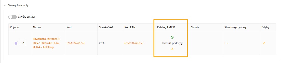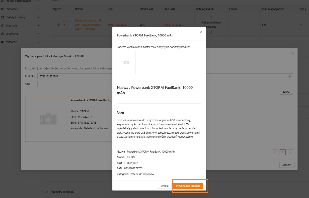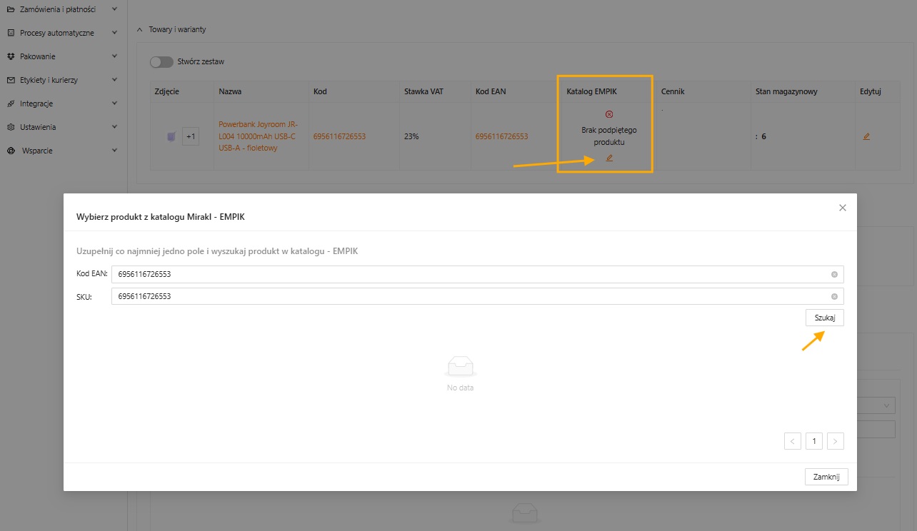 Po stworzeniu oferty należy przejść do sekcji „Towary i warianty” i zweryfikować kolumnę „Katalog Mirakl” czy produkt jest podpięty. Jeżeli nie, należy go podpiąć -> klikając ikonę ołówka. Korzystając z wyszukiwarki produktów z katalogu Mirakl, możemy użyć kody EAN lub SKU do wyszukania produktu. Następnie wybrać właściwy i przypisać ten produkt do oferty.