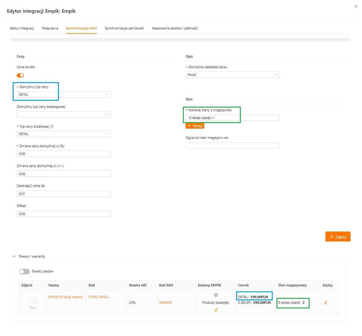 Dokładną cenę i stan widać w sekcji Towary i warianty na podpiętym towarze.
