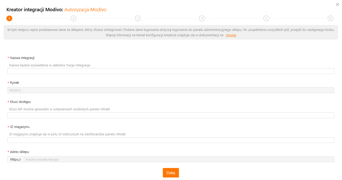 Z uwagi na to, że kreator jest dedykowany do integracji z Modivo, to pola Rynek i Adres sklepu są już automatycznie uzupełnione.