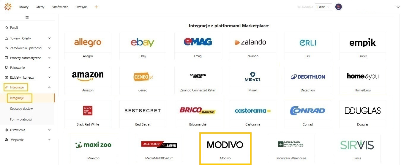 - W sekcji Integracje z platformami Marketplace należy wyszukać tej z logo i nazwą Modivo