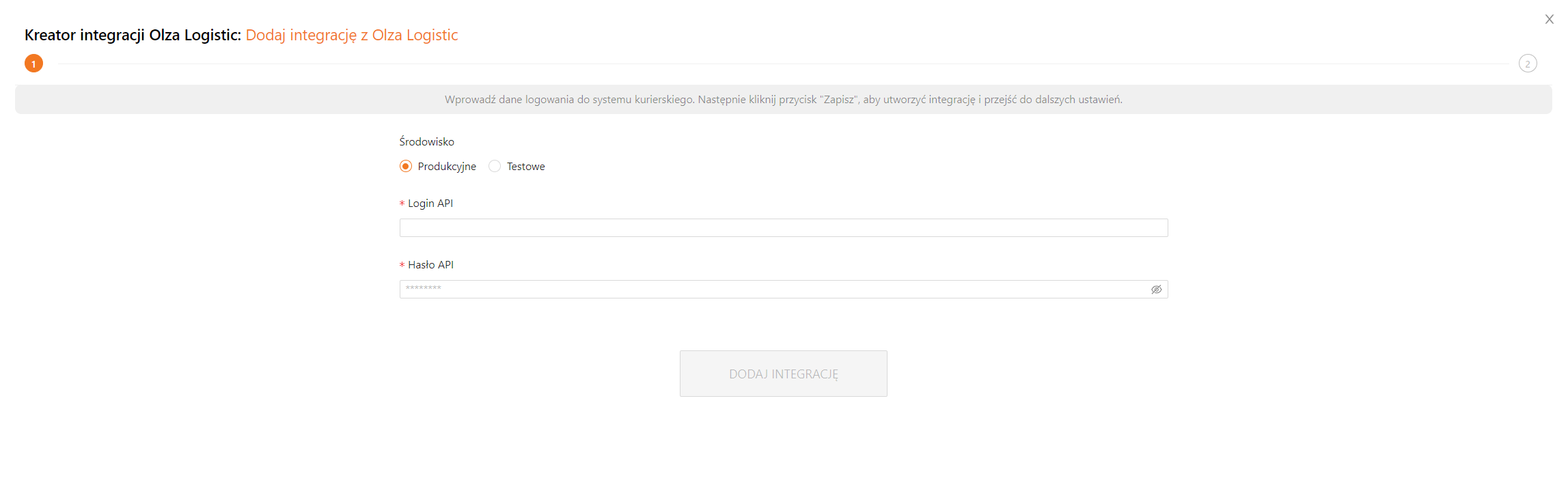 Olza Logistic udostępnia odseparowane środowisko testowe. Jest to opcja przeznaczona dla zaawansowanych użytkowników. Jeśli łączysz się ze środowiskiem testowym, pamiętaj, że posiada ono ograniczenia (m.in. nie udostępnia wszystkich metod wysyłki), a także oddzielne dane logowania. Szczegółowe informacje uzyskasz u przewoźnika. - Wprowadź dane logowania – Login API i Hasło API.