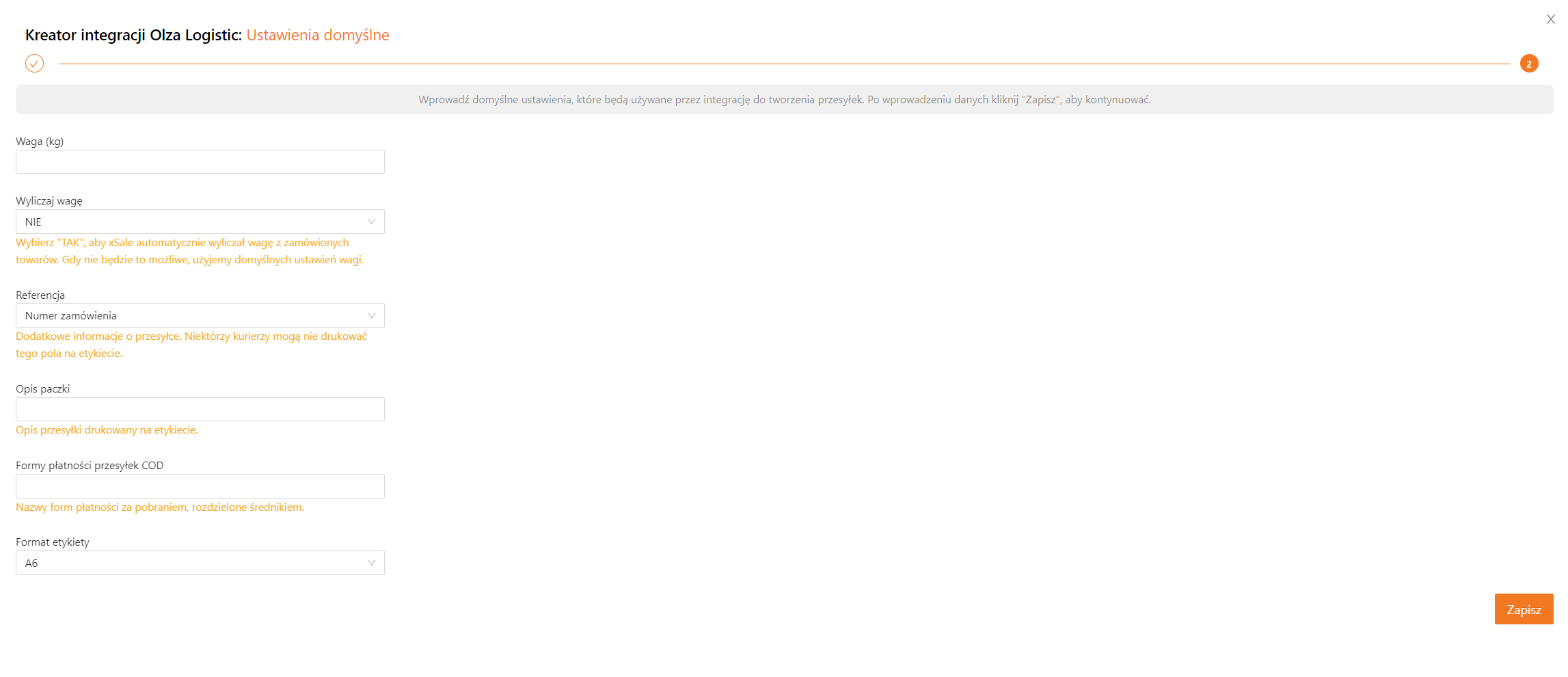 Przed dodaniem integracji upewnij się, że podajesz poprawne dane – w przeciwnym razie nie będzie możliwe połączenie z API przewoźnika, a co za tym idzie, xSale nie będzie w stanie utworzyć przesyłek do Twoich zamówień. Kliknij przycisk Dodaj integrację. - Skonfiguruj domyślne ustawienia. xSale użyje ich tworząc przesyłki metodami dostępnymi w integracji z Olza Logistic.