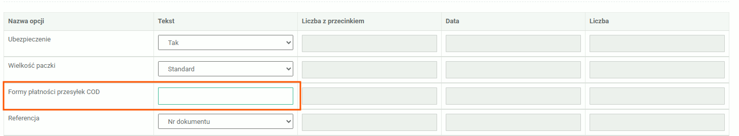 W polu „Formy płatności przesyłek COD” należy wprowadzić dokładne nazwy form płatności występujących w zamówieniach z opcją płatności przy odbiorze. Wartości te muszą być zgodne z nazwami widocznymi w zamówieniach.