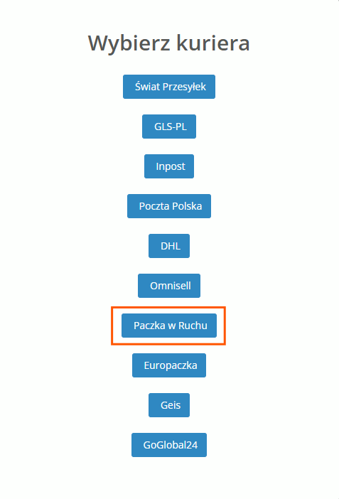 Po wyświetleniu listy dostępnych integracji kurierskich należy wybrać opcję „Paczka w Ruchu” (nazwa usługi dawniej funkcjonująca, która obecnie jest pod marką Orlen Paczka), co spowoduje przejście do formularza konfiguracji.