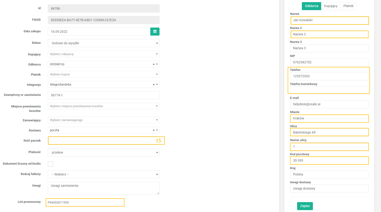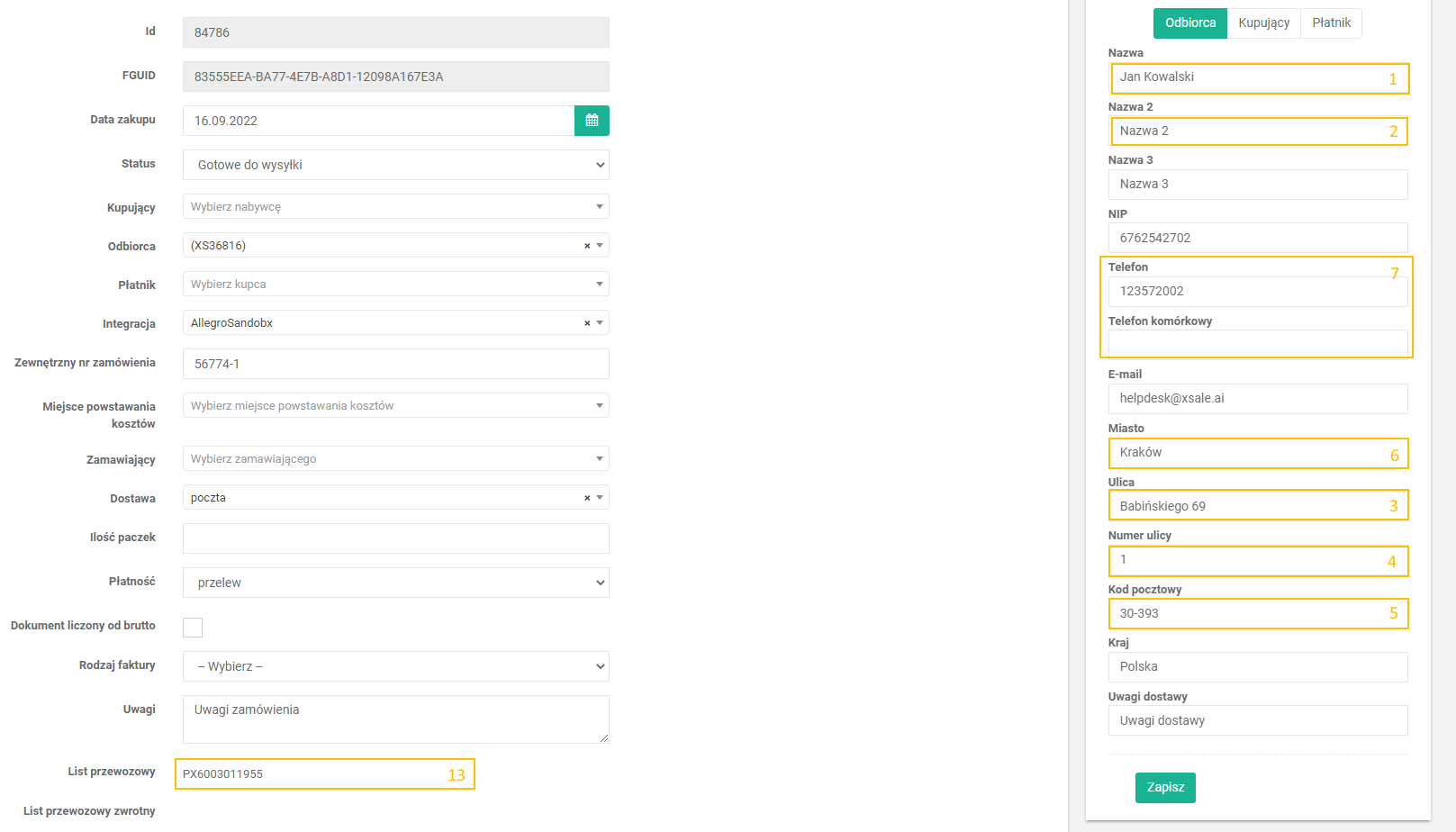 | Formularz zamówienia > Formularz adresu > Odbiorca | Telefon / Telefon komórkowy | 7 | Adresat | Telefon | 7 | Jeśli „Telefon komórkowy” nie jest uzupełniony to brany jest „Telefon”. |