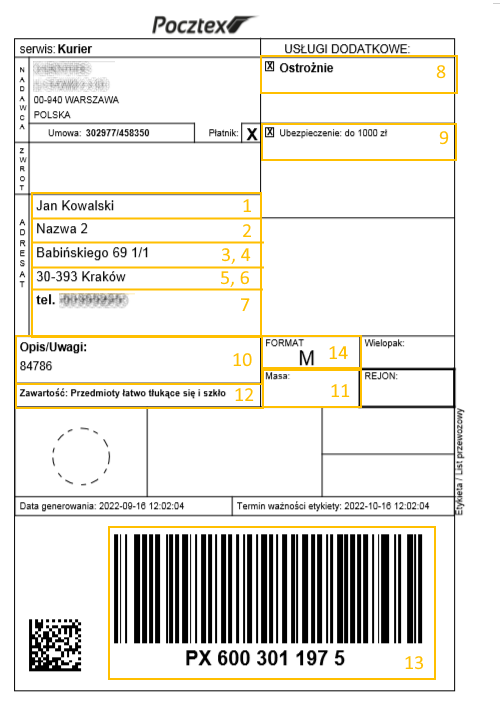 Poniższa tabela prezentuje zakres przesyłanych między xSale a Pocztą Polską danych na przykładzie wygenerowanej etykiety.
