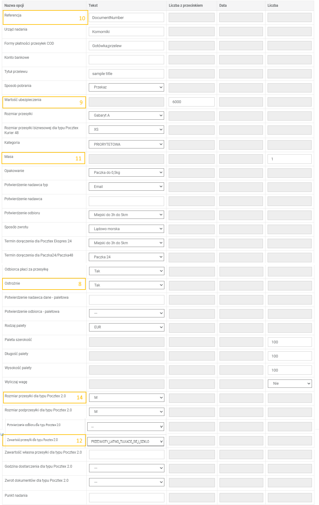 | ShipmentTask > Poczty Polskiej | Ostrożnie | 8 | Usługi dodatkowe | Ostrożnie | 8 | Możliwość zaznaczenia innych usług dodatkowych przewidzianych dla danego sposobu dostawy. |