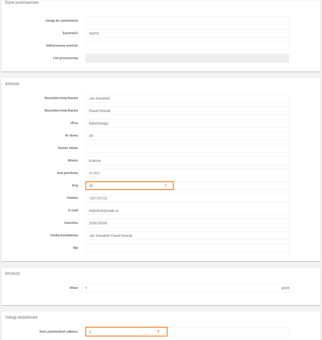 | Dane specyficzne > Formularz danych przesyłki | Kraj | 7 | Odbiorca | Kraj | 7 | Wyświetlana jest pełna nazwa kraju w jezyku angielskim. Nazwa kraju w danych Odbiorcy na zamówieniu w xSale powinna być podana w języku polskim. |