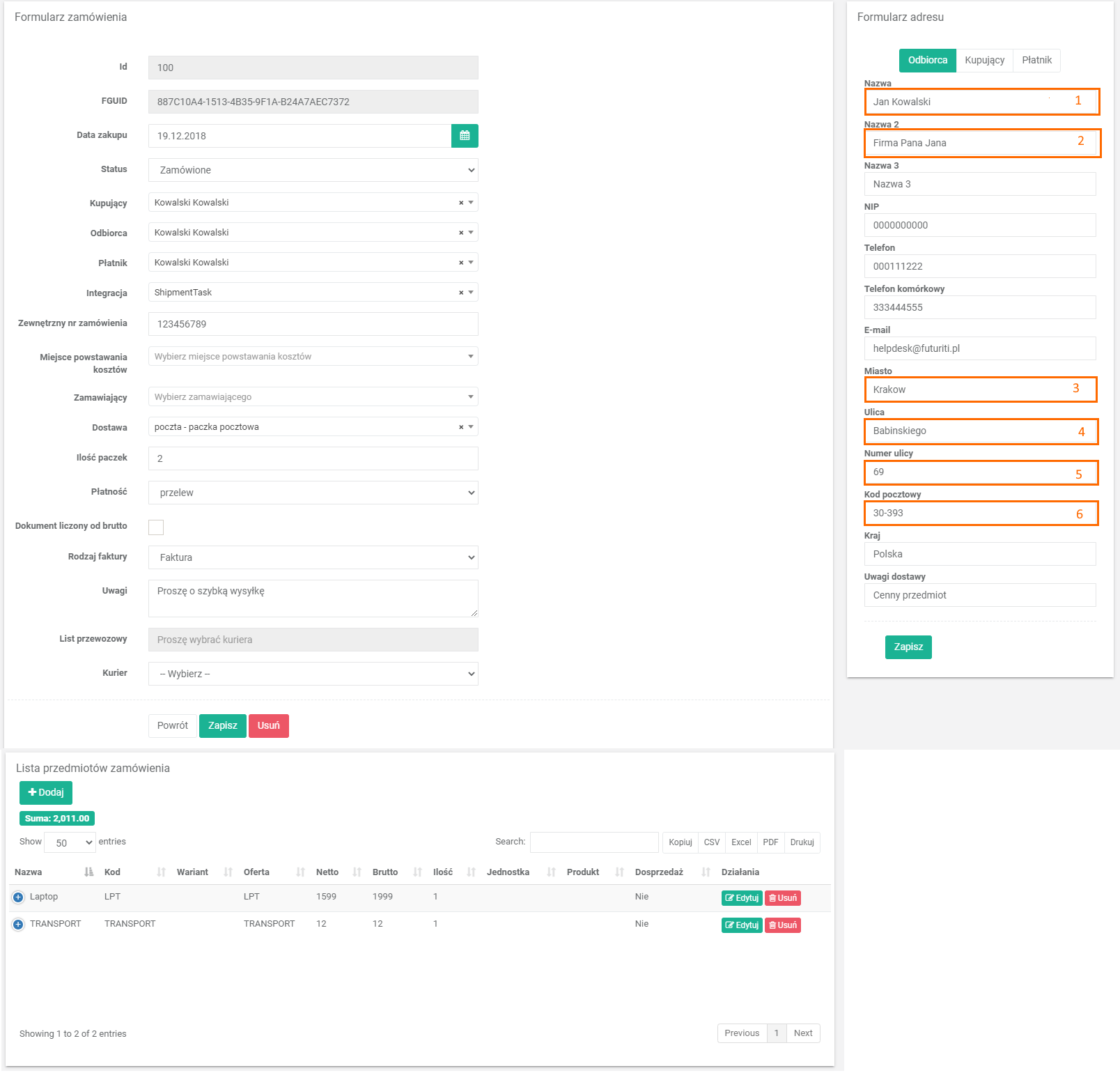 | Formularz zamówienia > Formularz adresu > Odbiorca | Miasto | 3 | Odbiorca | Miasto | 3 | |