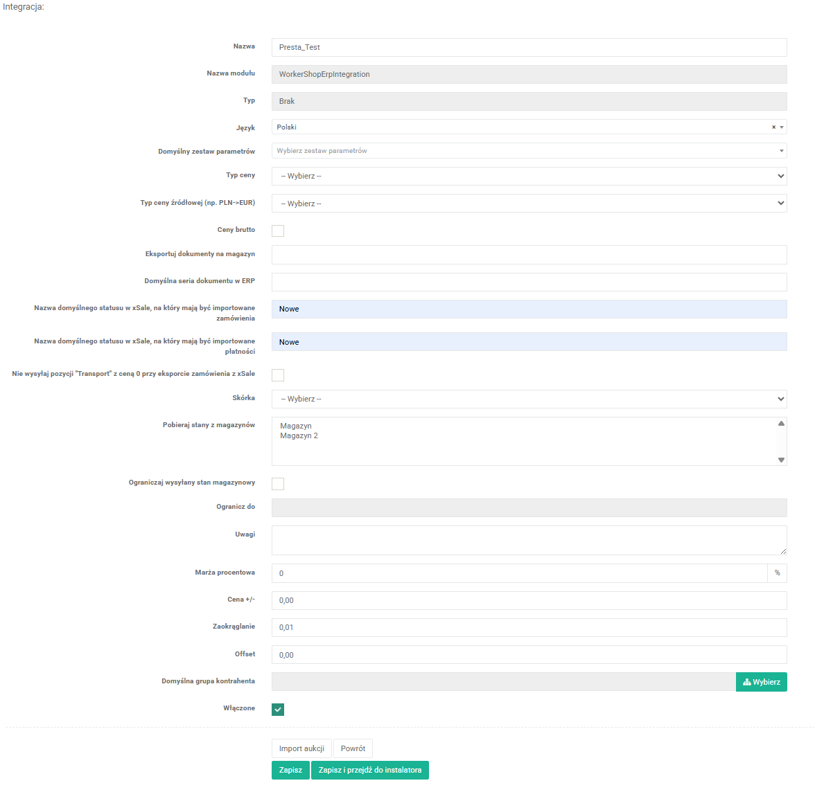 - Zaznacz check-box Włączone, wtedy integracja po dodaniu będzie od razu aktywna