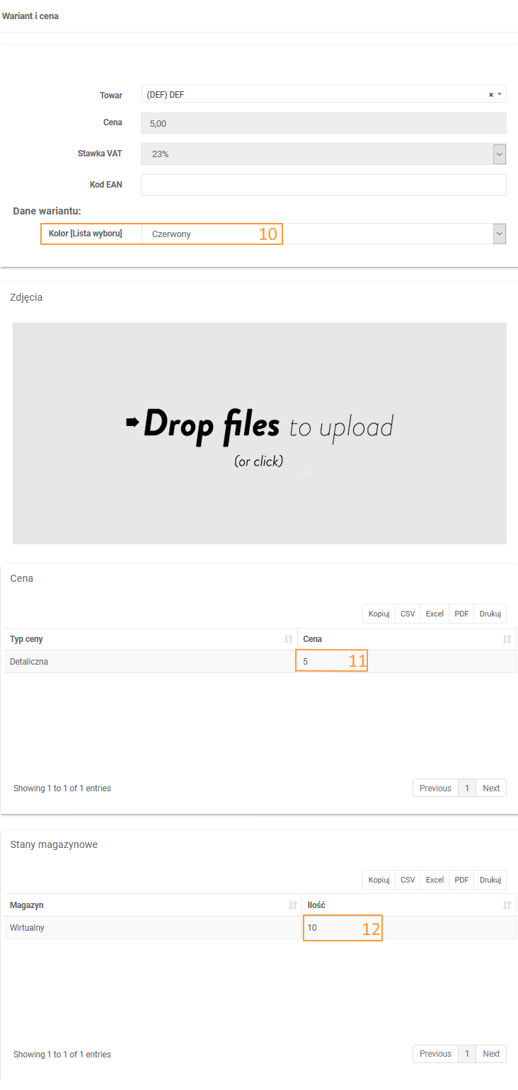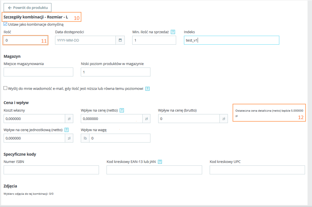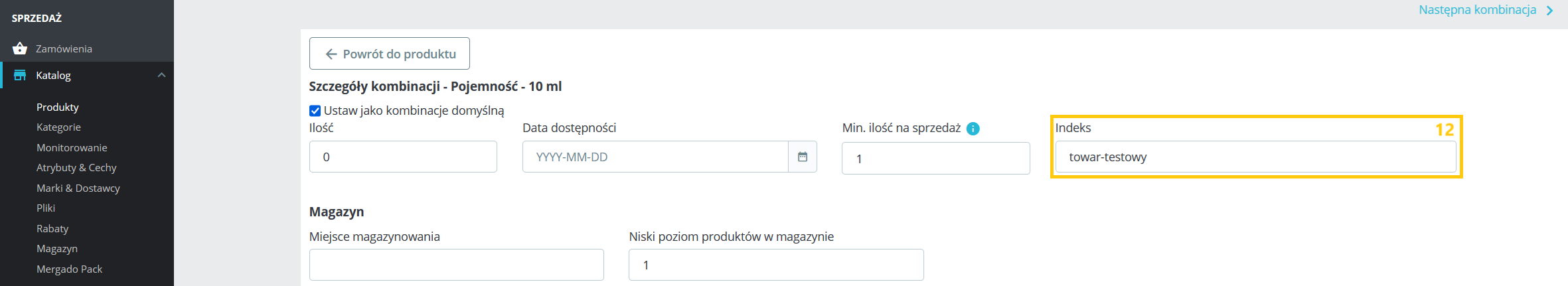 | Oferta -> Edycja -> Warianty i ceny -> Edytuj | Dane wariantu | 10 | Katalog > Produkty > Edycja > Kombinacje > Edycja | Szczegóły kombinacji | 10 | * Dla produktu z kombinacjami |