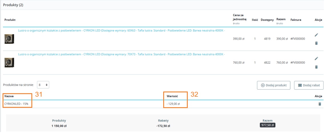 - Informacje o rabatach i ich wartościach na zamówieniu