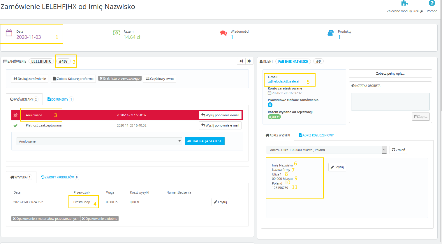 | Edycja zamówienia > Formularz adresu > Kupujący | Nazwa 2 | 19 | Sprzedaż -> Zamówienia -> Zobacz -> Klient -> Adres rozliczeniowy | Nazwisko | 12 | W przypadku, gdy klient w Presta nie poda danych do faktury pobierane są dane adresowe do wysłania przesyłki |