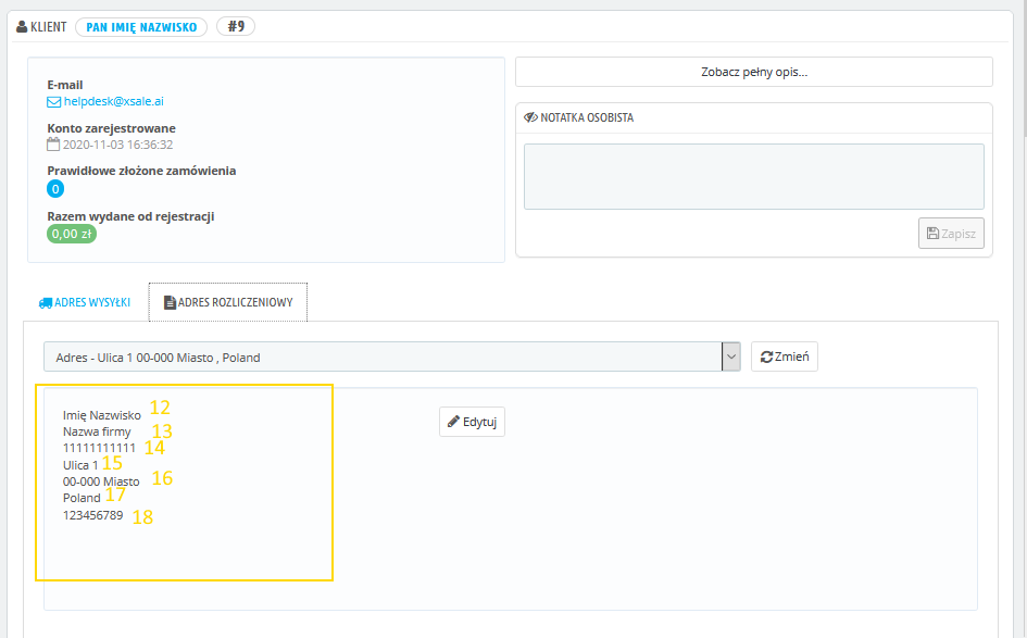 | Edycja zamówienia > Formularz adresu > Kupujący | 22 | Sprzedaż -> Zamówienia -> Zobacz -> Klient -> Adres rozliczeniowy | 5 | |||