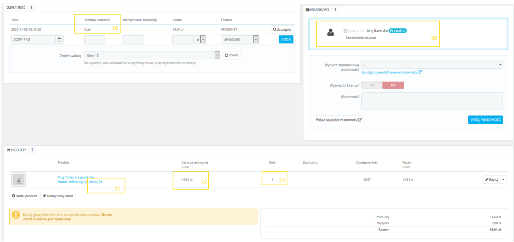 | Edycja zamówienia > Formularz zamówienia | Uwagi | 6 | Sprzedaż -> Zamówienia -> Zobacz -> Wiadomości | Wiadomości | 20 | |