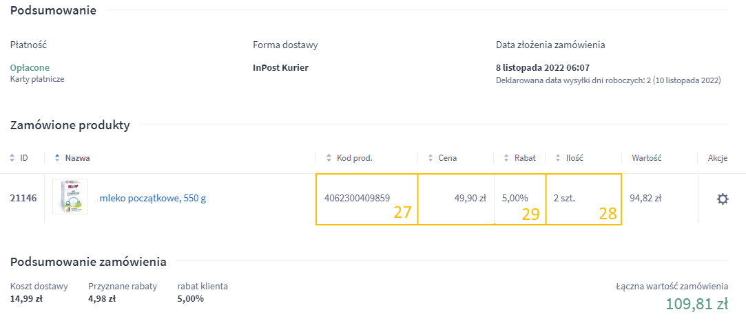| Edycja zamówienia > Lista przedmiotów zamówienia | Brutto | 28 | Edycja Zamówienia > Dane klienta> Zamówione produkty | Cena | 29 | Od pozycji „Cena” jest obliczany ewentualny rabat procentowy. |