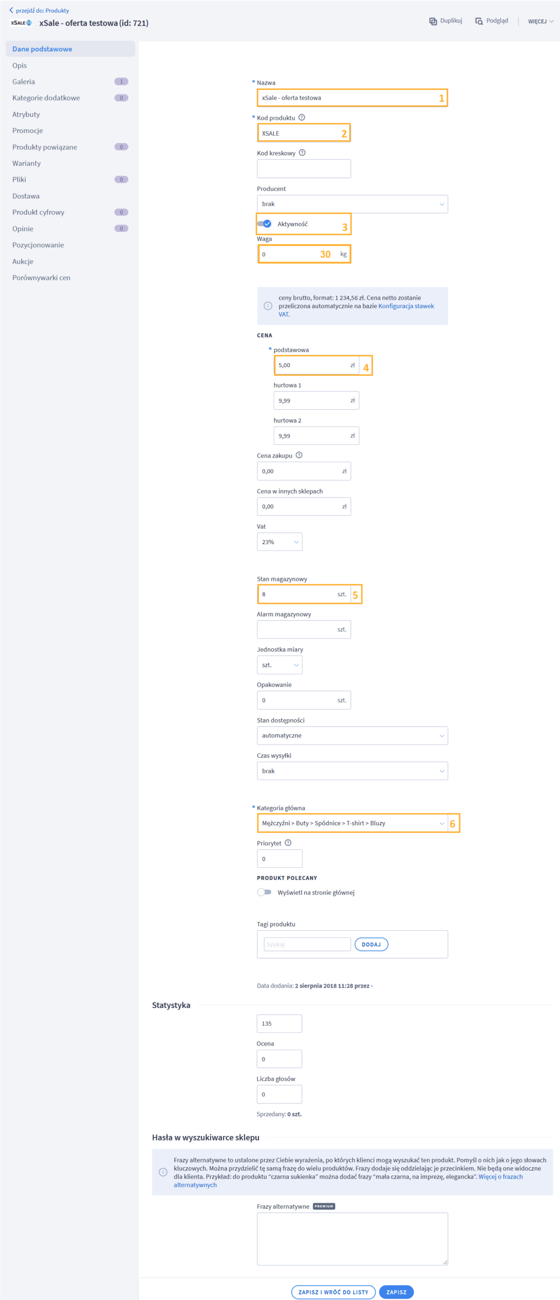 | Oferta -> Edycja -> Informacje dodatkowe o ofercie | Kod | 2 | Produkty > Edycja > Dane podstawowe | Kod produktu | 2 | |