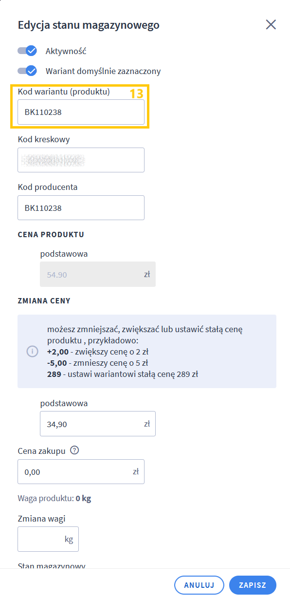 | Oferta -> Edycja -> Towary i warianty -> rozwiń wariant (+) | Kod | 14 | Produkty > Edycja > Warianty > Stan magazynowy > Akcje > Edytuj | Kod wariantu (produktu) | 10 | Pole kod wariantu (produktu) uzupełniane jest polem Kod z xSale. |
