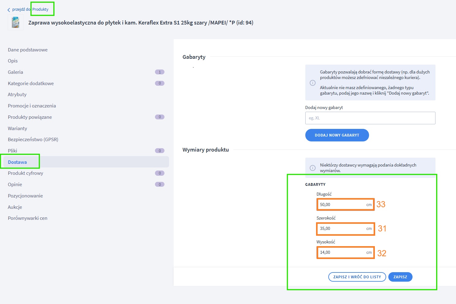 | Towar -> Edycja -> Podstawowe | Szerokość | 33 | Produkty -> Edycja -> Dostawa – > Wymiary produktu | Szerokość | 31 | Wartość w centymetrach |