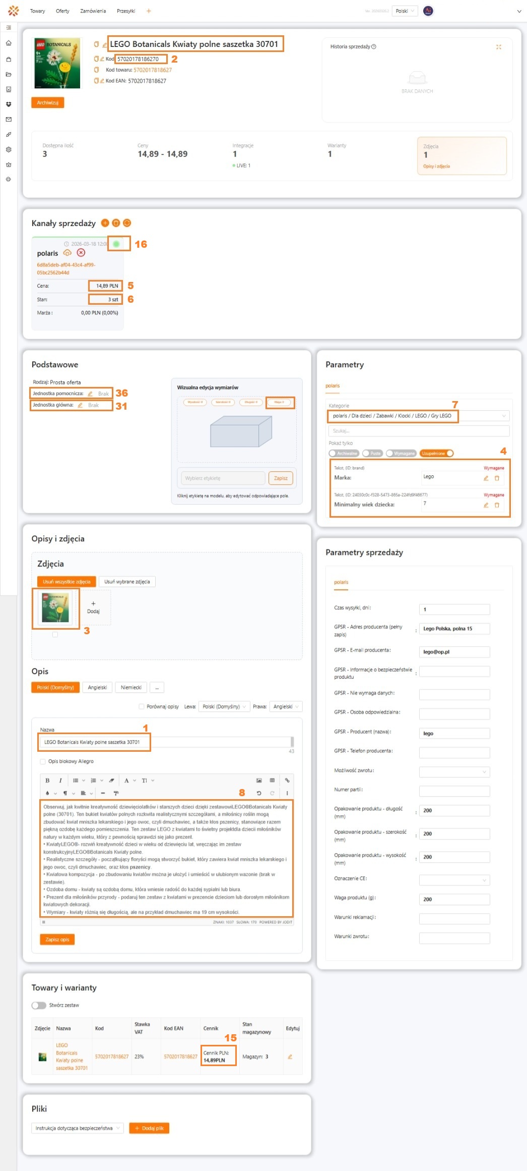 | Oferta -> Edycja -> Opis i nazwa oferty w poszczególnych językach | Opis (z języka domyślnego wybranego dla integracji) | 8 | Produkty > Edycja > Opis | Opis produktu | 7 | |