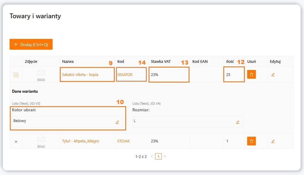 | Oferta -> Edycja -> Towary i warianty -> rozwiń wariant (+) | Dane wariantu | 10 | Produkty > Edycja > Warianty | Wybrana grupa wariantów np. Rozmiar, Kolor | 9 | Dotyczy produktu z wariantami według wybranego parametru np. Kolor, Rozmiar. Wariant użyty do tworzenia oferty musi być z obsługą stanów magazynowych. |