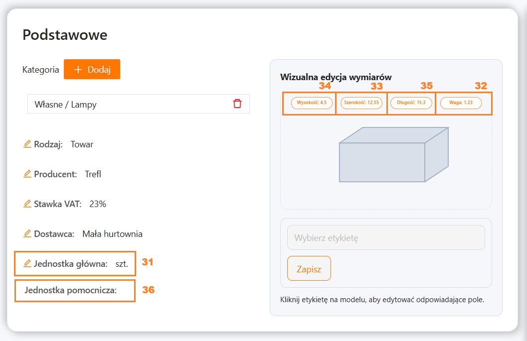 | Towar -> Edycja -> Podstawowe | Wysokość | 34 | Produkty -> Edycja -> Dostawa – > Wymiary produktu | Wysokość | 32 | Wartość w centymetrach |