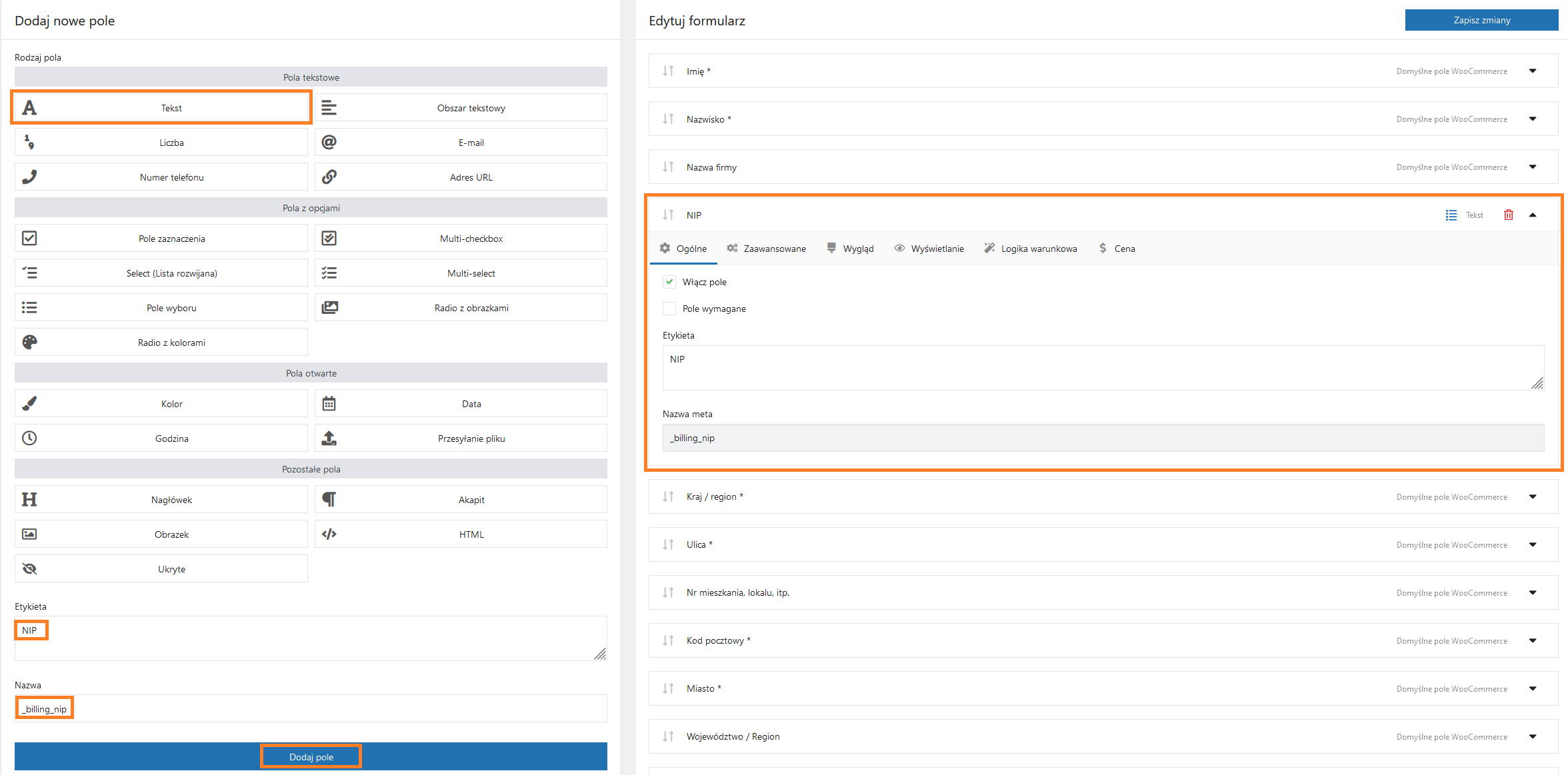 Po przejściu do sekcji Pola zamówienia, w obszarze Pola Tekstowe wybieramy „Tekst”. Następnie w sekcji Etykieta wpisujemy „NIP”, a w Nazwa wpisujemy „_billing_nip”. Po wypełnieniu tych danych klikamy w „Dodaj pole”. Po poprawnym utworzeniu pola, wyświetli on się po prawej stronie w sekcji Edytuj formularz.