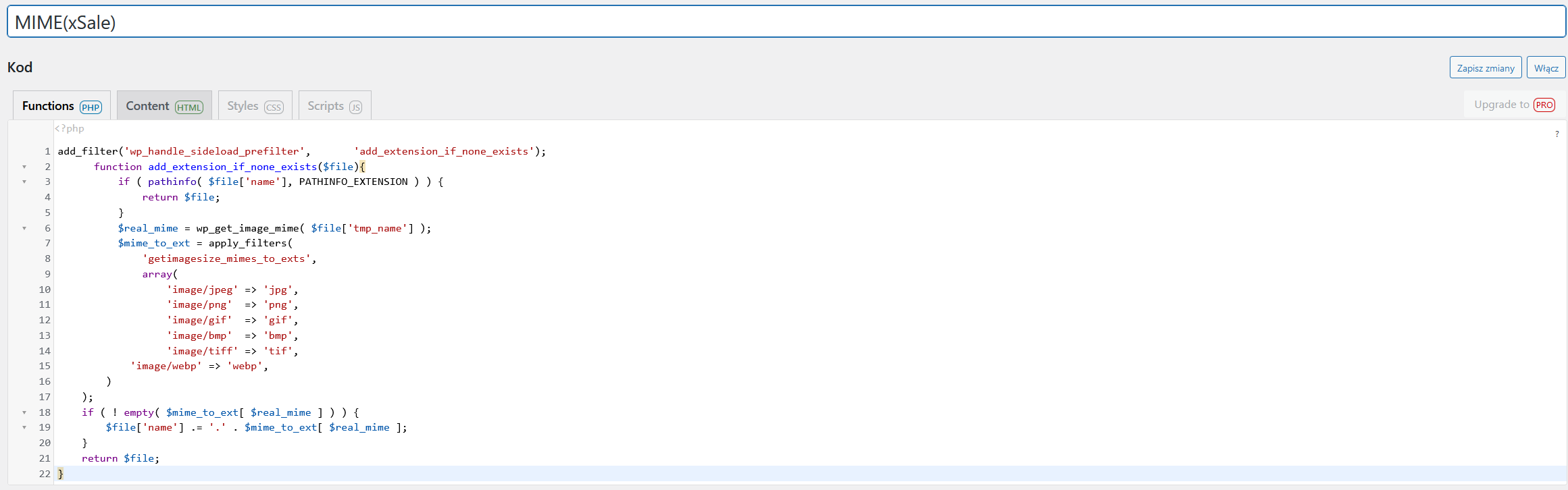 Po instalacji wtyczki, przechodzimy do zakładki Fragmenty kodu i wybieramy „Dodaj nowy”.  Wpisujemy nazwę MIME, wklejamy kod, zapisujemy zmiany i klikamy „Włącz”.