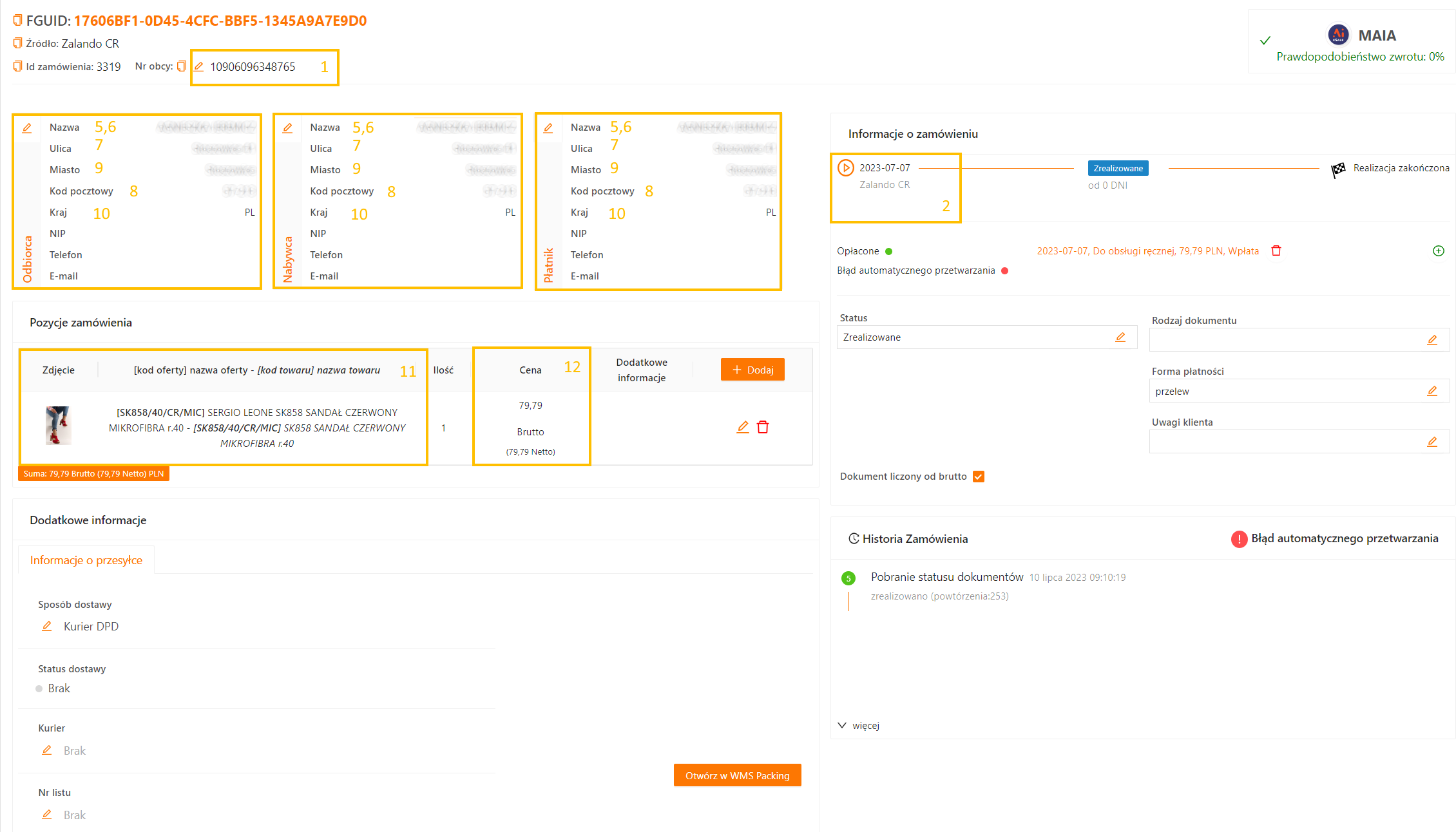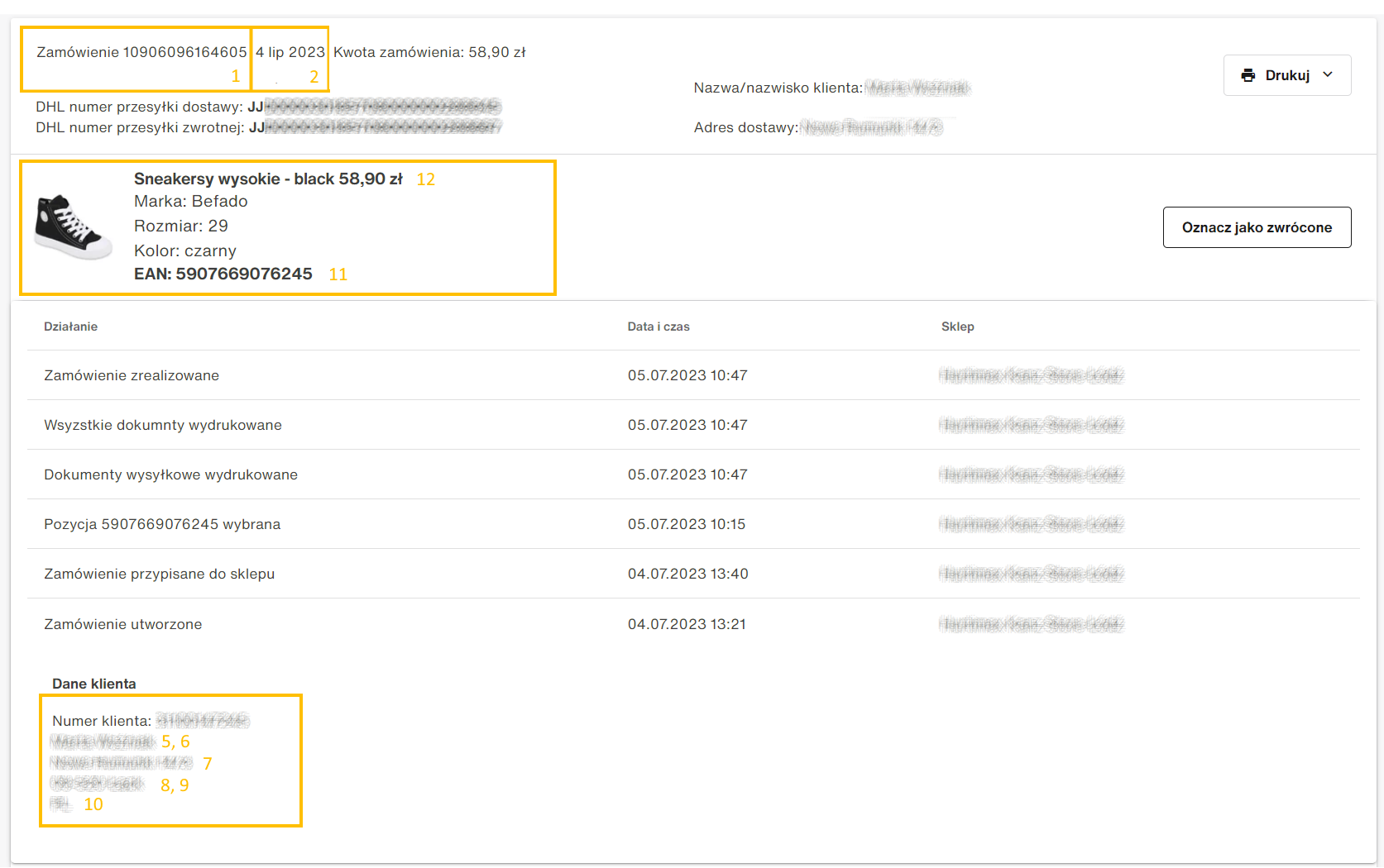 | Edycja zamówienia > Formularz adresu > Odbiorca | Nazwa | 5 | Dane klienta | Imię | 5 | Są to dane bilingowe klienta |