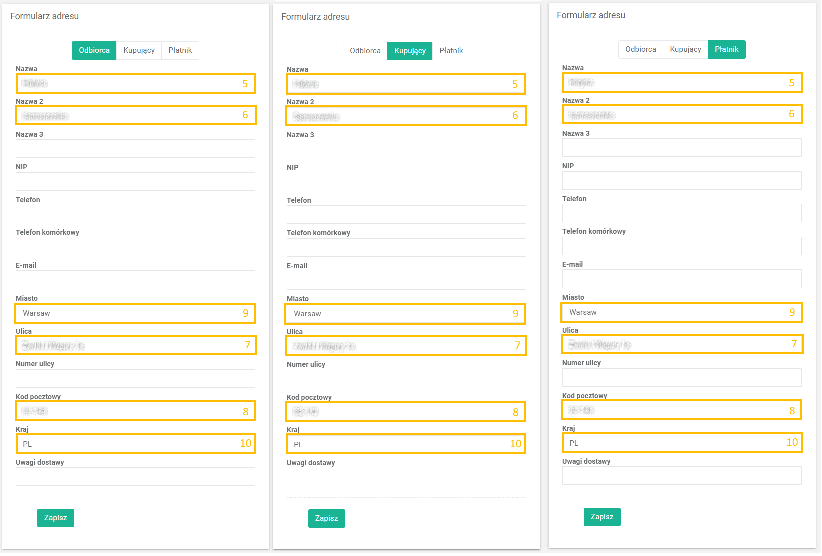 | Edycja zamówienia > Formularz adresu > Kupujący | Nazwa | 5 | Dane klienta | Imię | 5 | |
