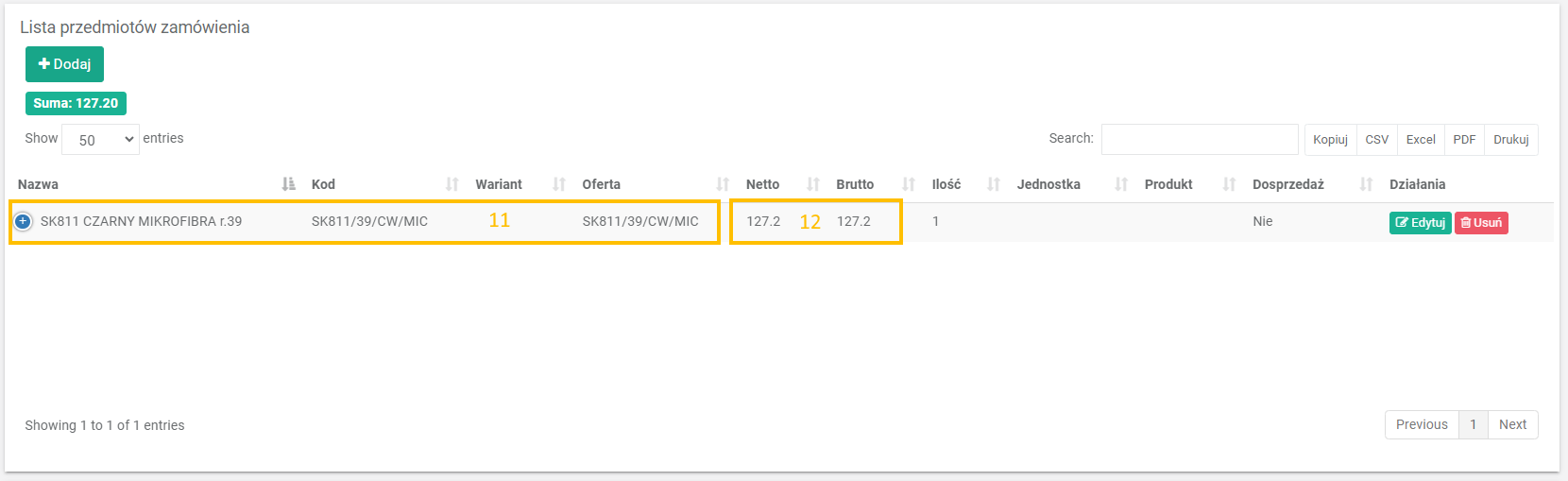 | Edycja zamówienia > Lista przedmiotów zamówienia | Brutto | 12 | Produkt | Cena | 12 |