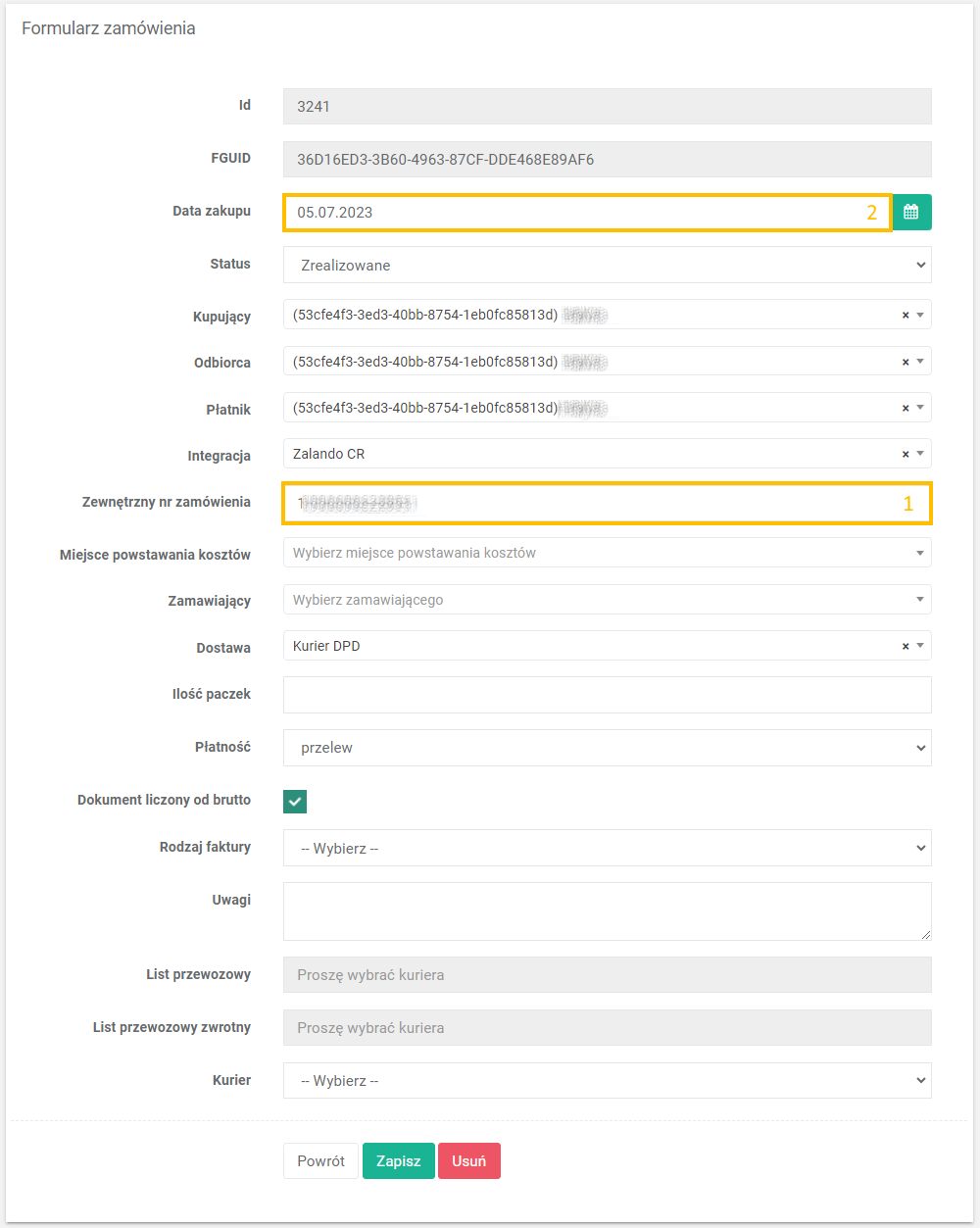 | Edycja zamówienia > Formularz zamówienia | Zewnętrzny nr zamówienia | 1 | Zamówienie | Zamówienie | 1 | |