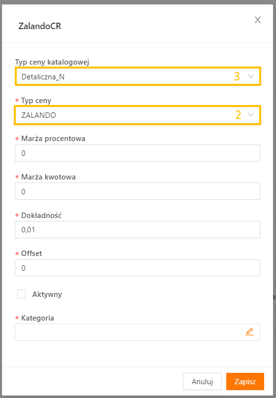 | Edycja kanału sprzedaży | Typ ceny | 2 | Panel zDirect – Edycja wariantu | Regular Price | 2 | Cena musi być uzupełniona na towarze w wybranym cenniku. |