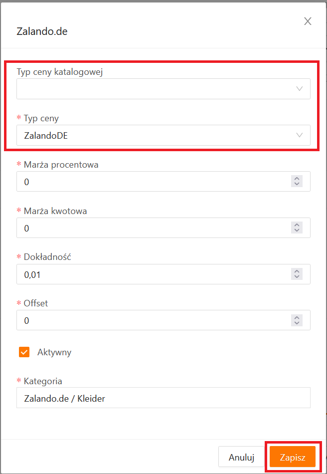 - W polu Typ ceny wskazujemy cennik domyślny dla kanału Zalando, który zawiera cenę podstawową produktu bez promocji w walucie obowiązującej dla danego kraju sprzedaży.