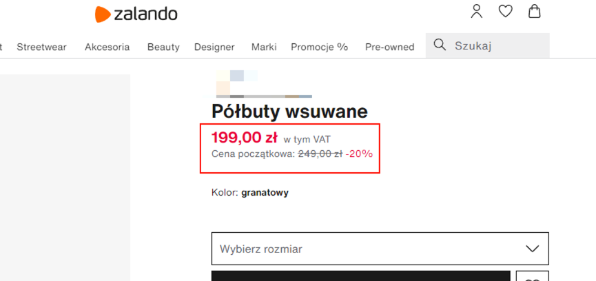 Typ ceny katalogowej- przekreślona cena widoczna w ofercie w Zalando