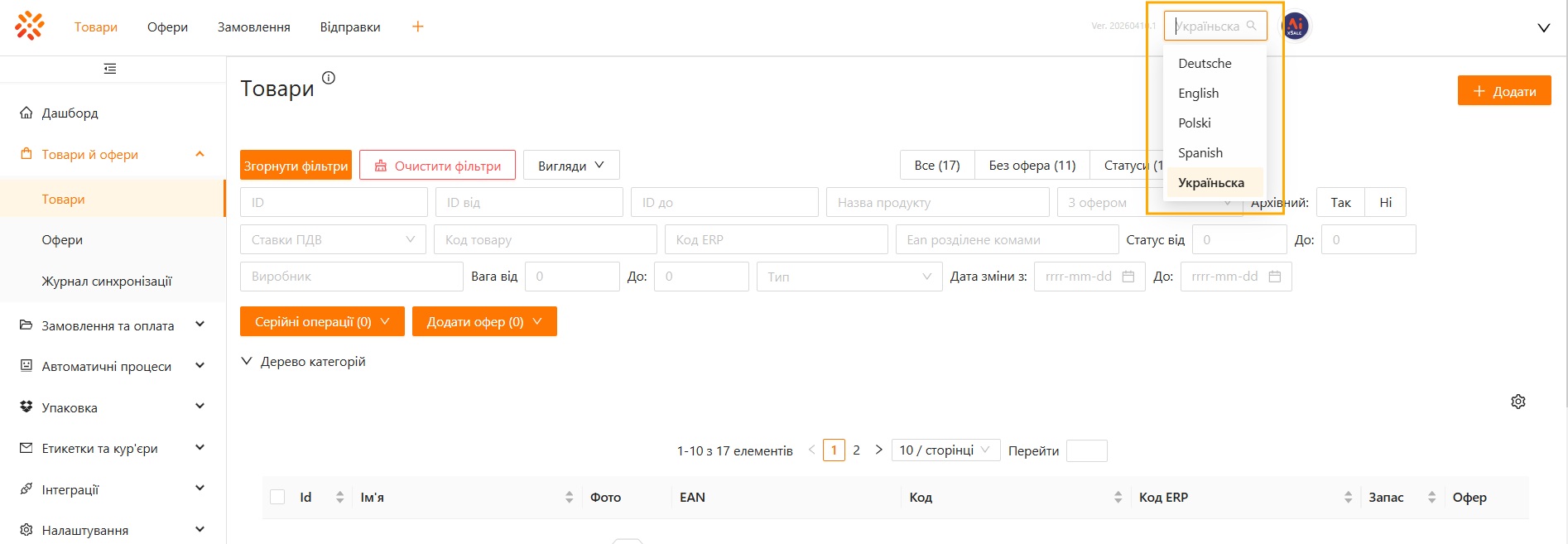 W xSale możesz zmienić język interfejsu aplikacji z poziomu górnego paska. To ustawienie dotyczy tłumaczenia panelu xSale i jest niezależne od języków opisów używanych na ofertach oraz w integracjach.