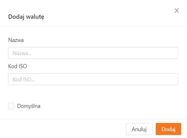 Aby utworzyć nową walutę, przejdź do listy walut i kliknij przycisk +Dodaj w prawym górnym rogu ekranu. Następnie uzupełnij nazwę oraz 3-znakowy kod ISO dodawanej waluty. Zdecyduj, czy ma to być waluta domyślna, a potem kliknij Dodaj.