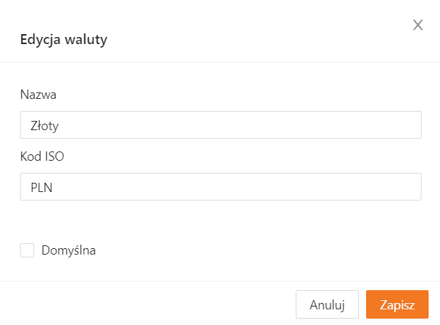 Po kliknięciu w wybraną pozycję otworzysz ekran edycji. W tym miejscu możesz zaktualizować informacje o walucie oraz (jeśli to potrzebne) oznaczyć ją jako domyślną. Po wprowadzeniu zmian kliknij Zapisz.