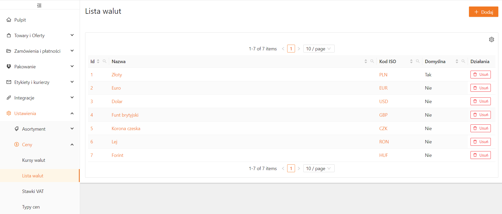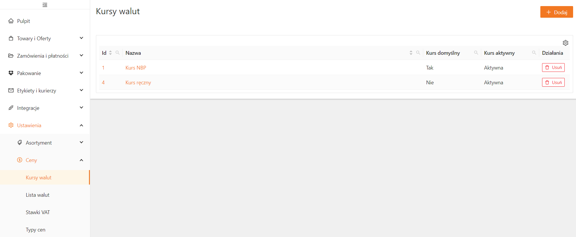 W razie potrzeby możesz usunąć walutę, klikając przycisk Usuń przy wybranej pozycji na liście.